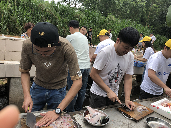 中午時(shí)分,便是野炊。所有團(tuán)隊(duì)人員,爭先搶著擇菜,洗菜,切菜,個(gè)個(gè)上心,心靈手巧,神情專注,像柔指在琴弦上滑動(dòng),在琴鍵上跳動(dòng),那些菜在他們手上簡直就是蝴蝶、蜻蜓、花朵,一劃一撥,簡直是在寫詩。如此曼妙,此景只有人間樂,誰聞天堂有此景。做菜烹調(diào)是難事,也是易事。說難,菜到什么味口,是有級(jí)別的,那是廚師的事,說易,人人搶著炒菜,沒誰說不好,照樣吃得津津有味,興趣盎然,好味,好味……一桌十幾樣菜,花花綠綠,群星燦爛,是勞動(dòng)成果,是智慧結(jié)晶,亦如我們團(tuán)隊(duì)業(yè)務(wù)上的成果,耀眼、驕人……
