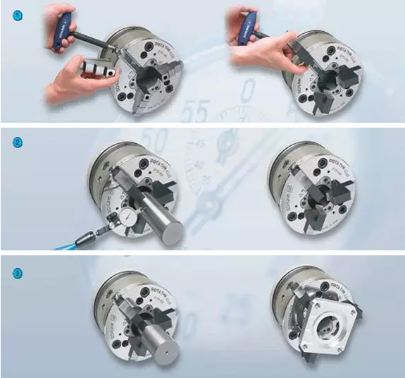 此卡盤具有快換爪功能,在保證重復定位精度的情況下,一分鐘快換所有卡爪,數秒鐘改變夾持直徑,卡爪的快換,有效降低了機床調整時間,工件加工時間得以延長。