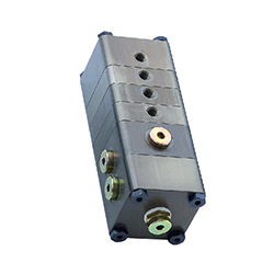 串聯(lián)設(shè)計”中的PM控制器,部分剖開。該控制器包含在4腔靜壓套筒導(dǎo)軌的液壓回路。PM調(diào)節(jié)器由所示的泵壓力連接塊、不同數(shù)量的調(diào)節(jié)器盤(圖中為三個調(diào)節(jié)器盤)組成。這一概念和串聯(lián)設(shè)計的控制器的優(yōu)點在于,所有口袋壓力都可以在控制器附近的控制器-靜壓口袋連接線的分支處集中測量,并且可以輕松更換控制器,例如在臟了的情況下。調(diào)節(jié)器和靜壓袋之間的管線應(yīng)盡可能短。