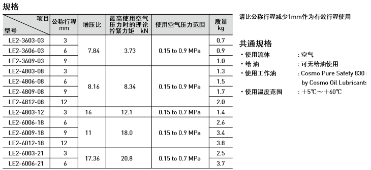 擰緊部件的工作速度隨使用增壓器而變化。超過左表速度使用會造成密封件早期磨損,脫落,由于混入空氣使輸出力降低,可能會造成空氣回路中混入油。尤其是如果增壓器的氣壓活塞返回時間比擰緊部件回復(fù)時間早,會是回路中油壓為負(fù)壓,造成混入空氣。