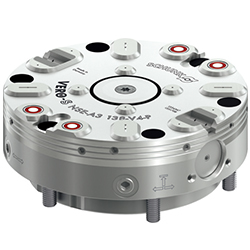 內(nèi)部裝配的彈簧組提供模塊的夾持力。軸向活塞和專利驅(qū)動機(jī)構(gòu)將彈簧力轉(zhuǎn)化為夾持銷上的最大下拉力。夾持是由兩個夾持滑塊實現(xiàn),自動鎖定。此外,集成的增壓功能會增大下拉力。模塊可使用 6 bar系統(tǒng)壓力打開。